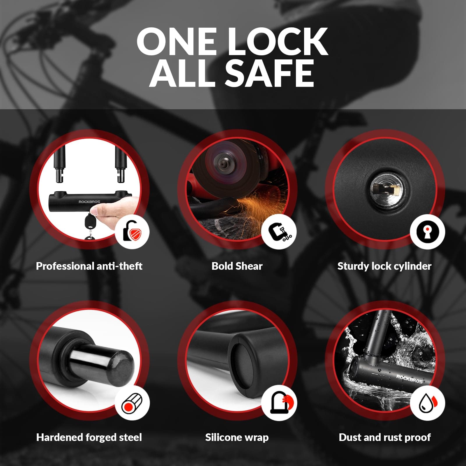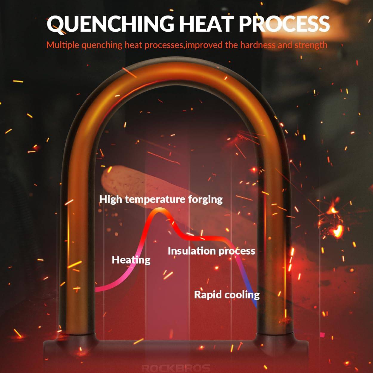 - Robusto contra robos: El acero de alta resistencia con tratamiento térmico aumenta la dureza y la seguridad del candado en U. El robusto cilindro de aleación de zinc es resistente al polvo y al óxido.