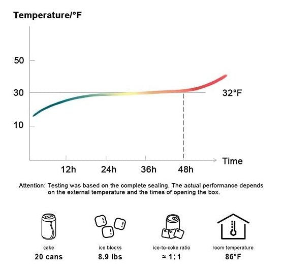 Hasta 48 horas de espera en frío. Después de la prueba en un interior de 30 grados: la temperatura después de 48h aumentó de -3° a 3°. Consiste en material aislado espesado de 840D de nylon exterior y poliéster 420D en el interior para mantener a Lenfood o bebidas frescos durante un tiempo extra. ATENCIÓN: Por favor, no ponga comida caliente dentro.